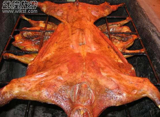 吃烤全羊算了一件很奢侈的事情,因为全羊只论整只算斤卖,一只羊下来估么也要千把个大洋。一只活羊跟你牵过来,一称重量大小觉得合适就算成交,交上押金,再出去活动3、5小时,香喷喷的烤全羊就在炭炉上出来了。武隆的烤全羊,麻、辣、干、香,围着炭火,戴上塑料手套,一人一把小刀就在烤羊上割起自己中意的部分,然后满口满口下咽。同时,店家还会留一部分来,跟你铁丝穿了,自己过一把烧烤的瘾。其他的羊杂碎,店家则给你加上武隆绿色食品之一的高山萝卜,炖出一锅鲜美的清汤来,如果你吃烤羊吃辣了,就可以喝上一碗羊杂碎汤,岂不妙哉。