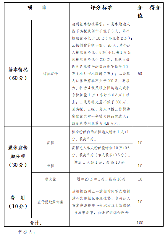 (四)达人要求:一是本地达人线下实探及创作不低于5人,单个粉丝量不低于10万(小红书2万);二是云探创作剪辑不低于20人,单个达人粉丝量不低于5万(小红书1万);总粉丝量不低于200万,且达人最近5条视频平均播放量不低于10万(小红书小眼睛2万);三是真人口播云剪辑不少于200条,要求为:抖音4级及以上团购达人或抖音粉丝量1万(小红书0.2万)以上;四是总曝光量不低于300万,且实探、云探、真人口播云剪辑约定数量其中一半需为纯品宣达人。