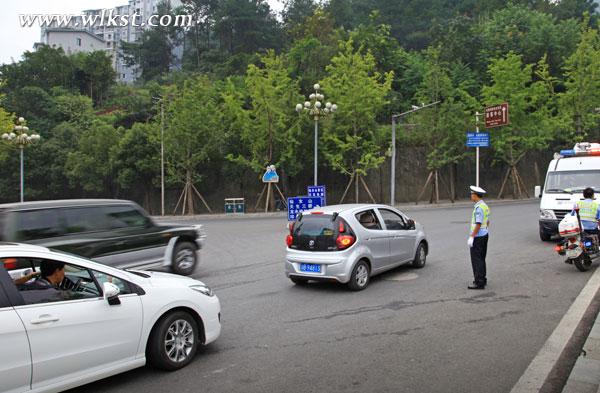武隆县城大转盘处,交警人员对过往车辆进行指挥。(图/王俊杰)