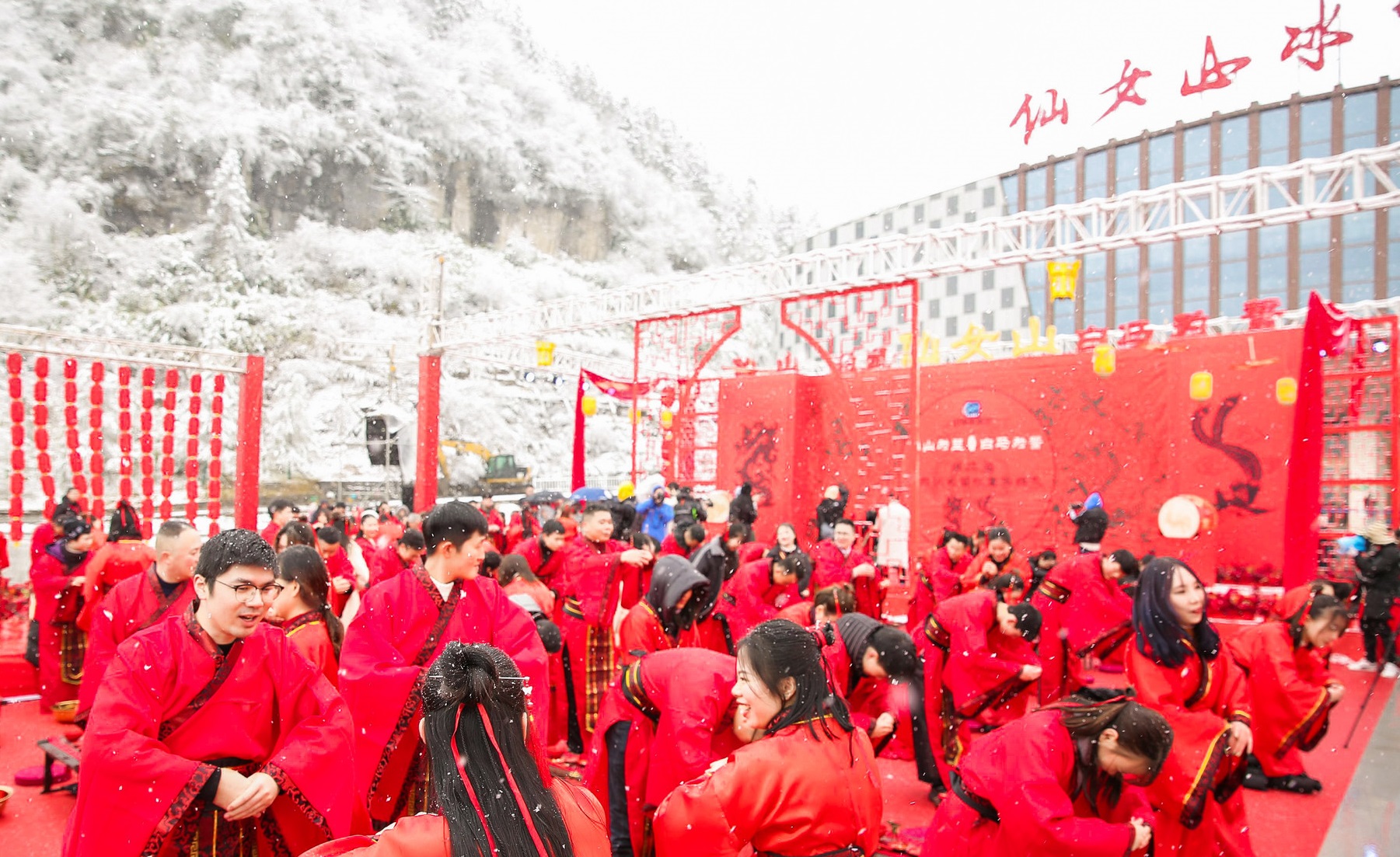 在零下3℃的极寒雪地间,举行汉式集体婚礼,恐怕终生难忘吧!就在2019第10届武隆仙女山冰雪季开幕式当天,一场盛大的汉式雪地集体婚礼举行,来自全国30余个省市、港澳台地区和俄罗斯的99对新人身穿大红色的汉服,体验了一把中国传统婚礼,成为白雪世界里最亮丽的风景线,场面盛大而又庄严。