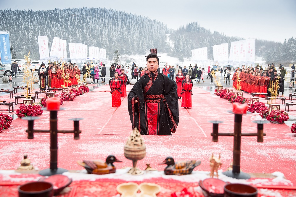 沃盥、同牢、合卺、解缨结发、执手礼……仪式严格按照汉式婚礼的古老环节进行,现场运用经典的红黑色,将典雅、尊贵、庄敬的气韵展现得淋漓尽致,围观的游客一同见证了这一浪漫时刻。而仪式举行时,仙女山更是应景地下着鹅毛大雪,似乎在向新人们送上“白头偕老”的祝福。