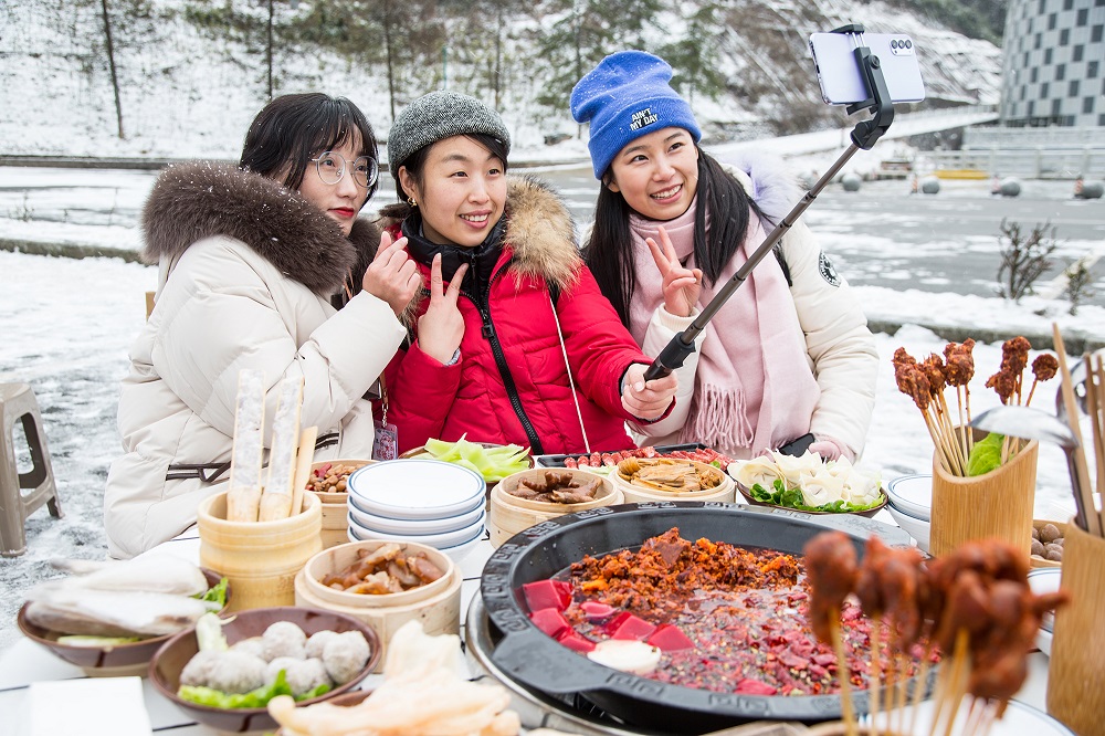 当天中午,仙女山就开启了一场别开生面的雪地涮火锅活动,火红的汤锅、翻滚的热情、醇厚的味道、洁白的冰雪,诸多元素叠加在一起,对于游客们来说注定是一次终身难忘的旅程。“好有意思哦,在雪地吃火锅,想都没想过。既然来了,肯定得试试!”一位游客表示。