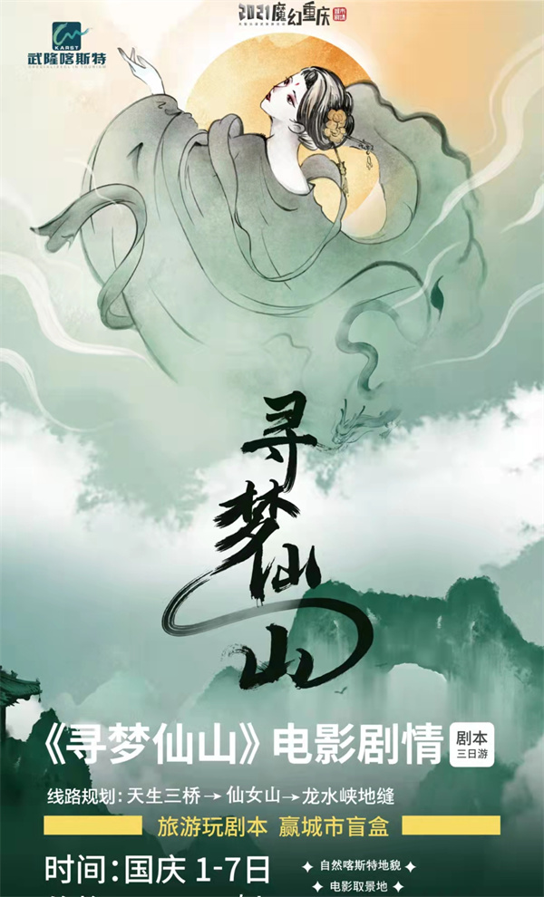 作为国内热门的影视取景地,武隆凭借独特的自然风光,吸引了包括《满城尽带黄金甲》、《变形金刚4》、《爸爸去哪儿2》、《三生三世十里桃花》、《我们十七岁》等众多影视及综艺节目到此拍摄取景,现已成为重庆旅游的文化名片。鬼斧神工的自然景观,加上浓郁的影视文化氛围,让《寻梦仙山》沉浸式剧本杀更新奇和神秘。国庆出发去武隆玩“剧本杀”,让我们拭目以待吧!