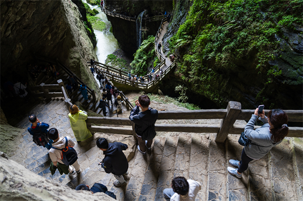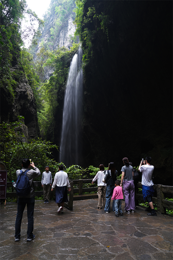 作为典型的武隆喀斯特地貌,世界自然遗产地的核心景区龙水峡地缝以“地球最美裂痕”的震撼景观持续霸屏社交媒体。上午,景区内已人潮涌动,游客沿着蜿蜒栈道深入千米地缝,仰望飞瀑悬泉、聆听峡谷回响,感受“一线天光穿云破雾”的奇幻体验。