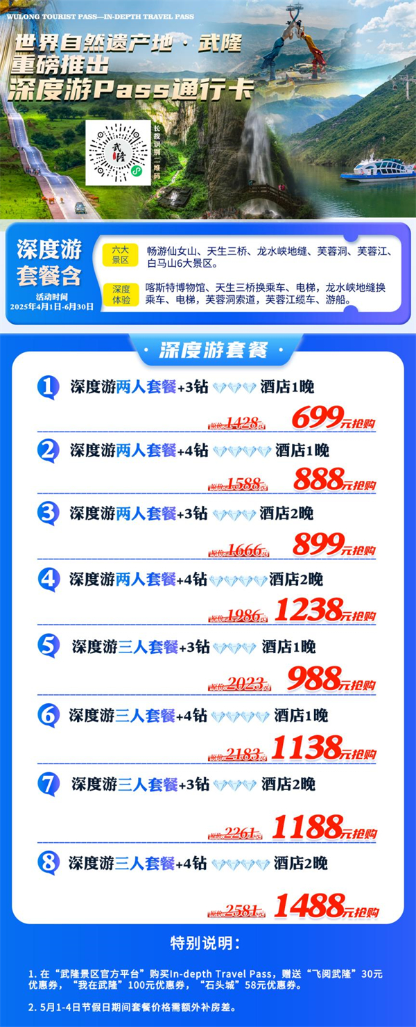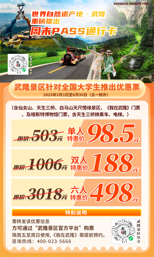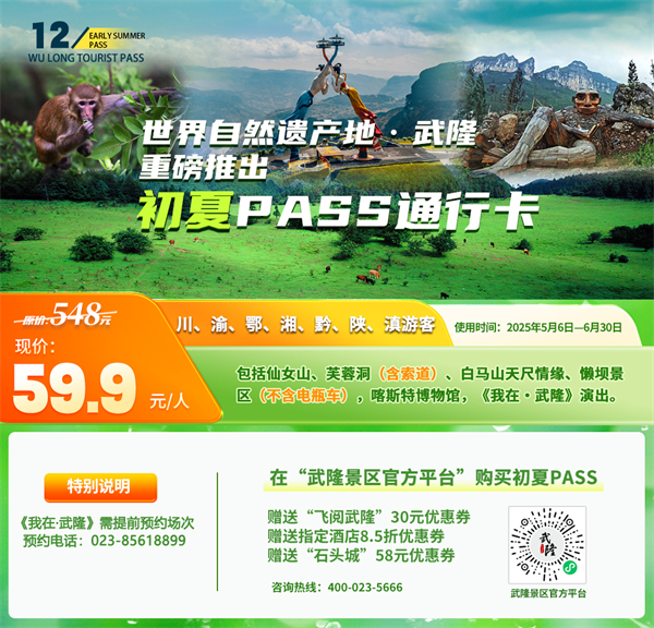 端午佳节,门票福利少不了!低至1.1折的初夏Pass,单人、双人、六人行的大学生周末Pass,更有六大景区+3钻、4钻酒店的深度游Pass任你选择,还有特殊人群Pass以及惊喜优惠券,1卡玩转武隆景区,性价比简直拉满!