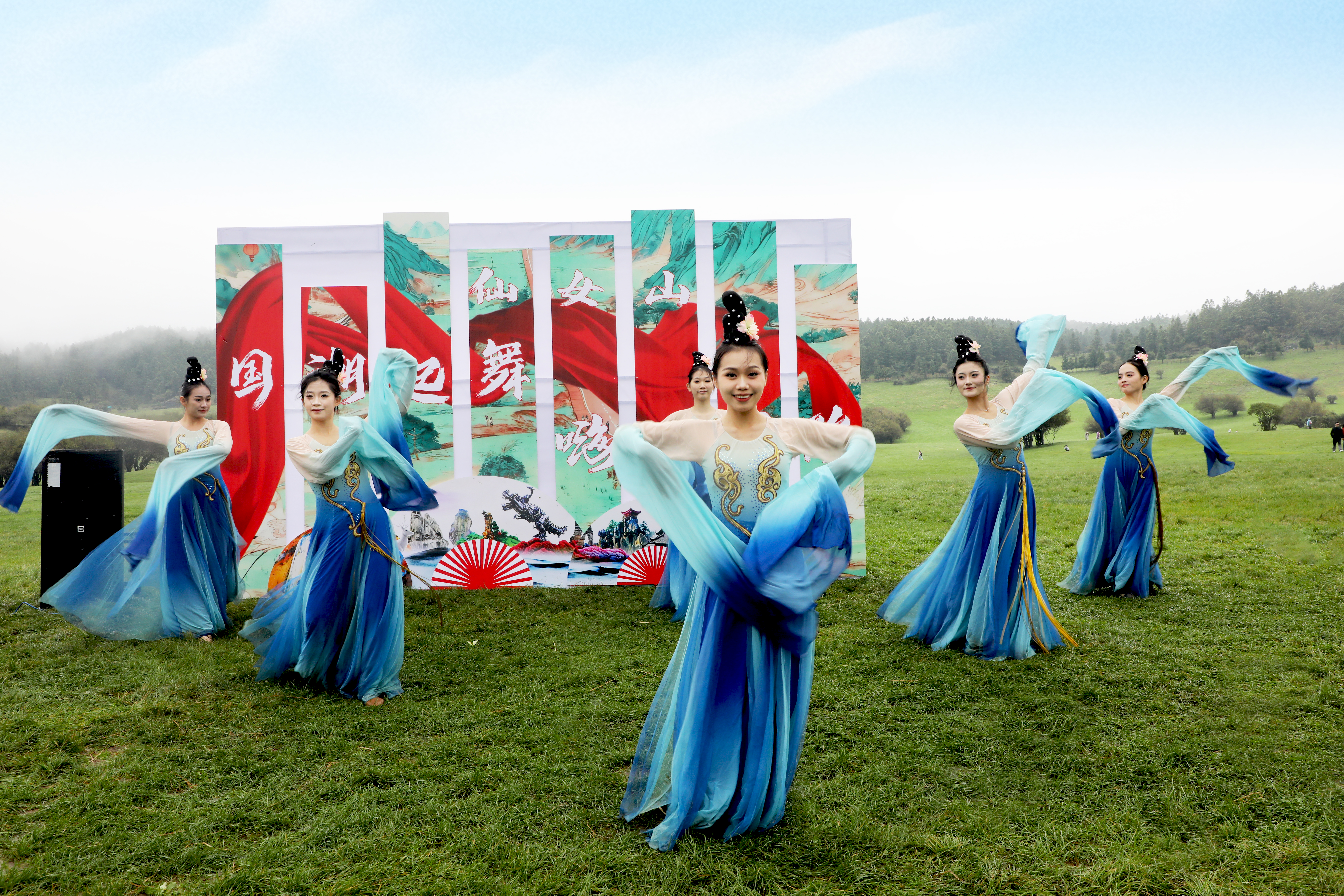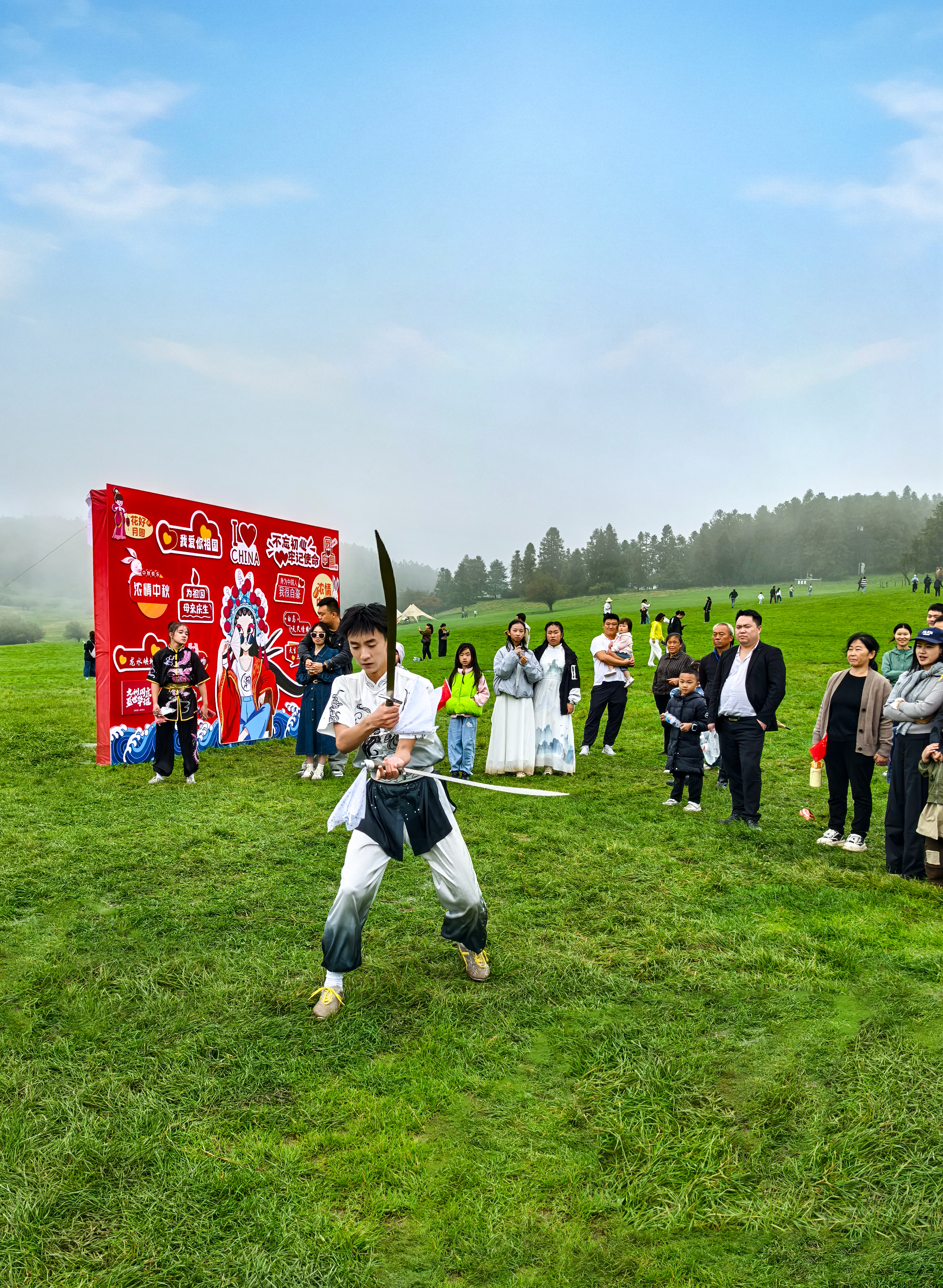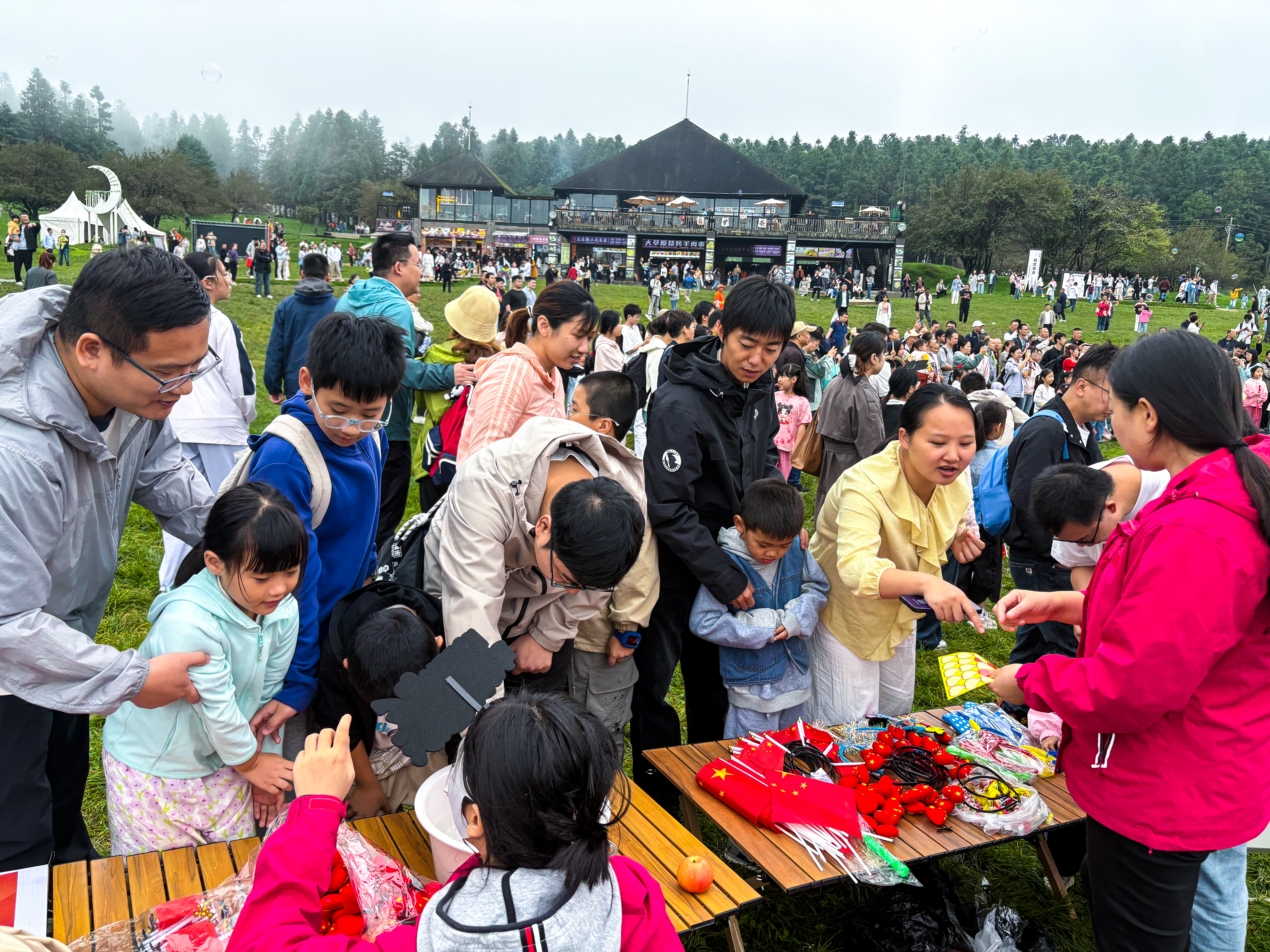 五大国潮活动成 “人气磁场”:仙女山景区,《丽人行》舞者刚谢幕,工作人员便摆出装满小国旗、“爱心” 贴纸、国旗发夹的礼品桌,孩子们围拢领取,成年人举旗与舞者同框,红旗下,草甸金黄与舞者朱红裙摆相映成趣。