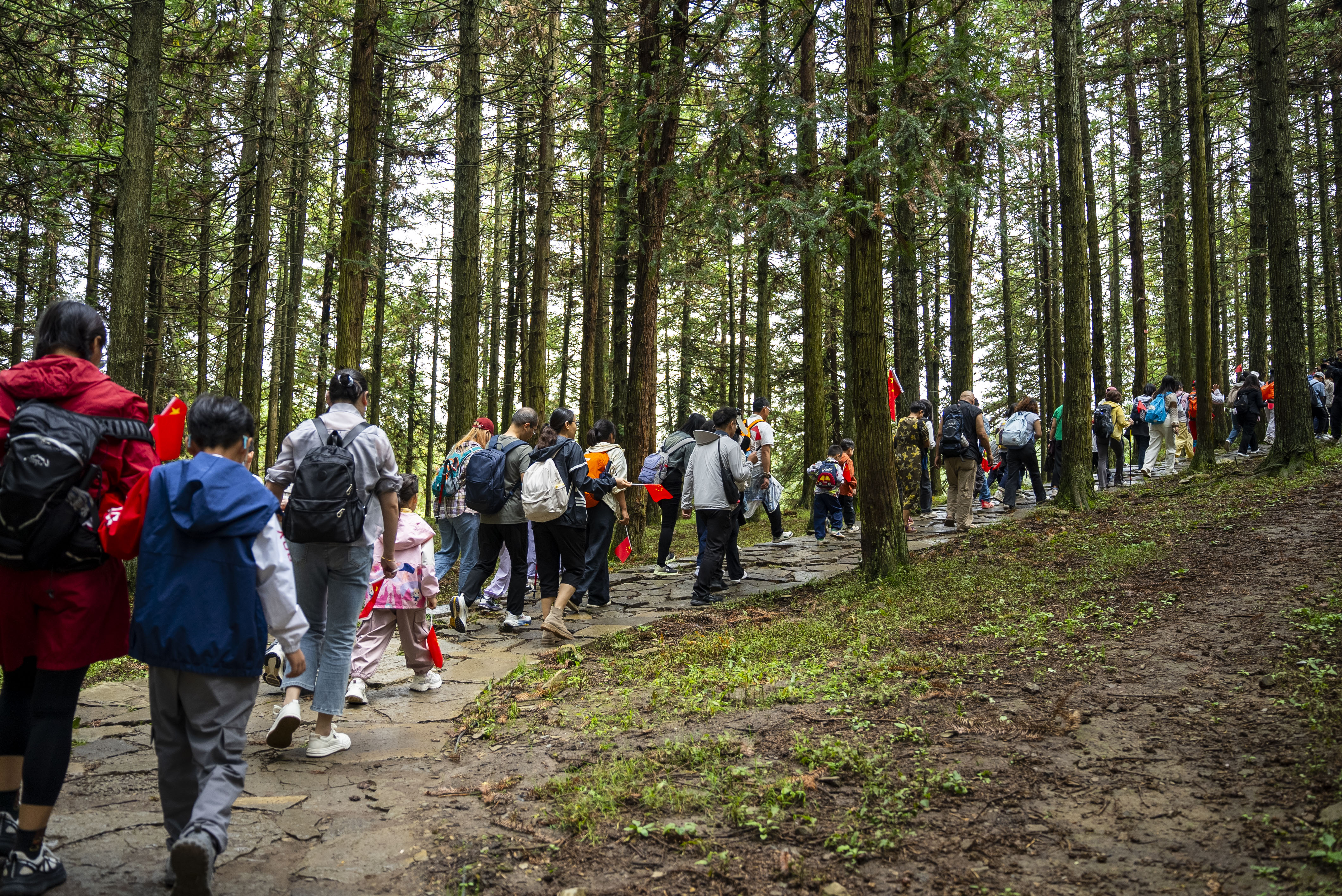 晨光点染,秋日的仙南牧道苏醒,身着亮色冲锋衣的徒步队伍沿山道绵延,不少人背包插着小国旗,登山杖声与 “国庆快乐” 的问候交织。