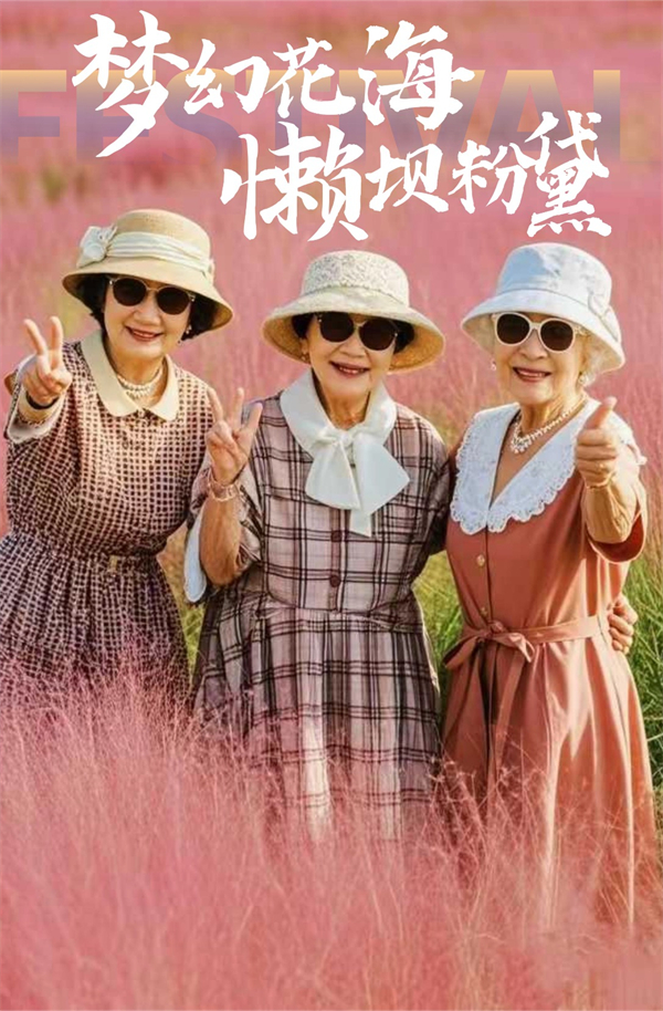 梦幻花海·懒坝粉黛:陪伴父母漫步于粉色花海,在如梦似幻的粉黛乱子草丛中悠闲散步,为母亲拍下美丽的照片,记录温馨时刻。