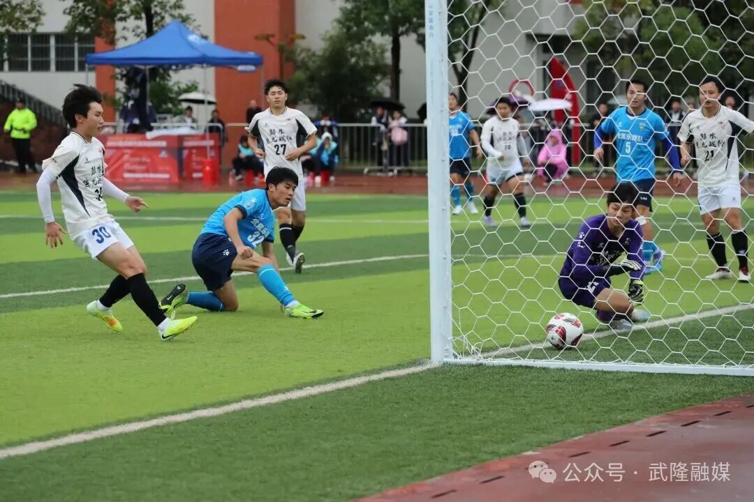 取得领先后,武隆队士气大振,进攻浪潮一波高过一波。他们似乎已经完全适应了雨战的节奏,利用流畅的团队配合持续撕扯对手的防线。上半场临近结束前,武隆队再度收获进球——通过一次精妙的前场传导,皮球在草坪中依然被顺畅输送,最终由埋伏在禁区前沿的球员晃过守门员,皮球贴地窜入网窝,2比0!球队带着两球的优势进入中场休息,已然掌握了绝对主动权。