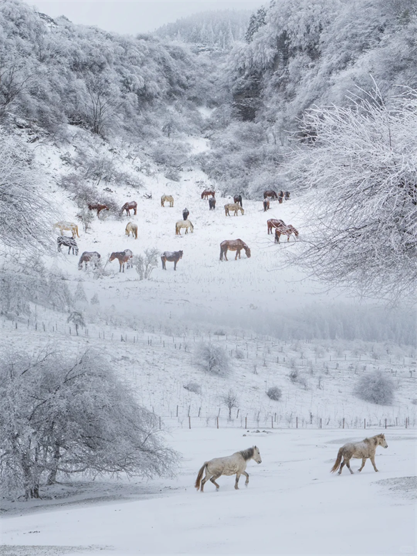穿行在仙女山的雪原之间,你会遇见冬日的魔法——树枝裹上晶莹的冰羽,阳光穿过林梢洒下钻石般的光点。每一口呼吸都是清冽的,每一步脚印都是崭新的。在这里,你不是过客,而是闯入冰雪童话的造梦者。