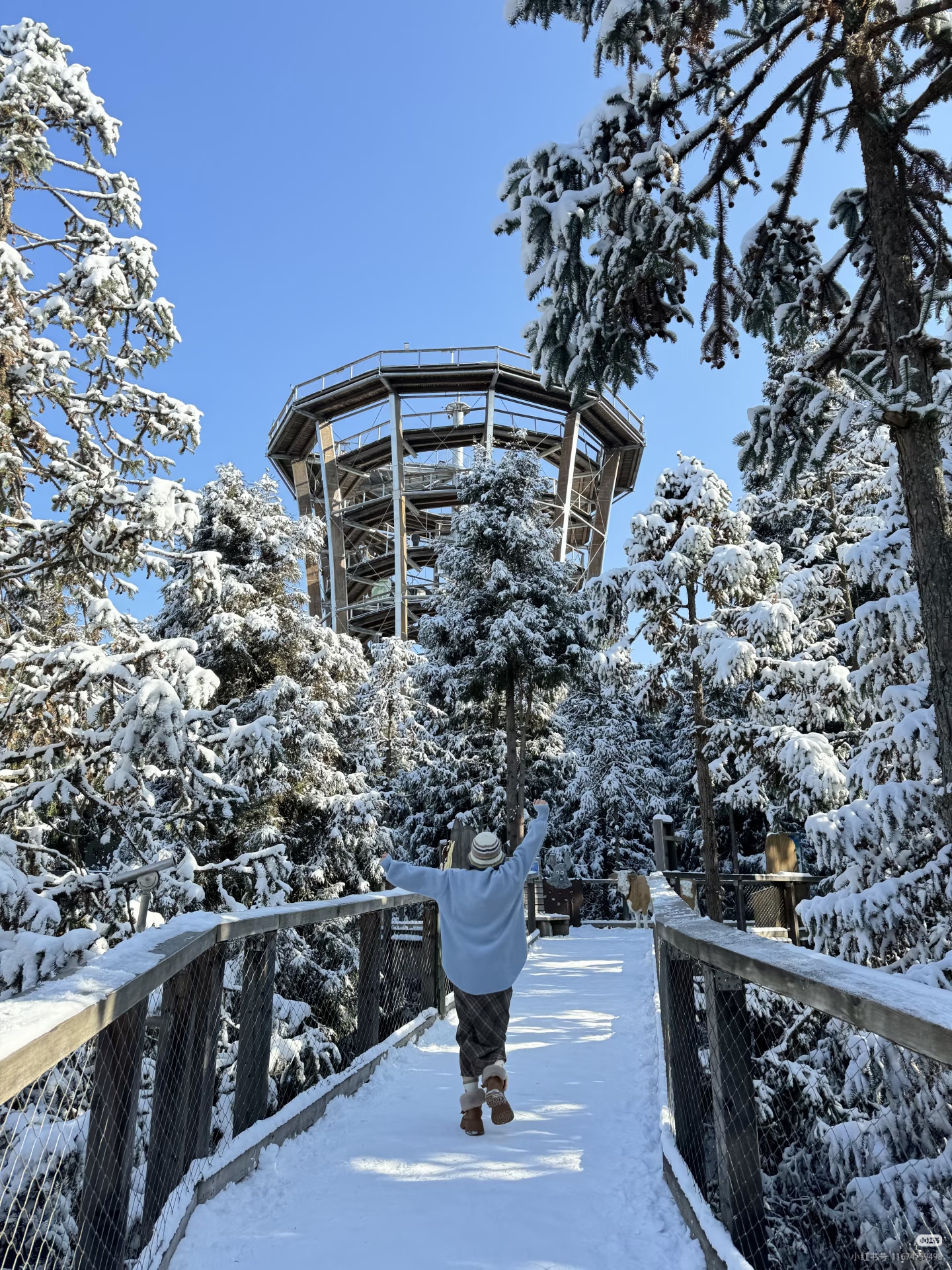 木屋的尖顶、蜿蜒的栈道、静默的松枝,都被覆上柔软而诗意的轮廓。