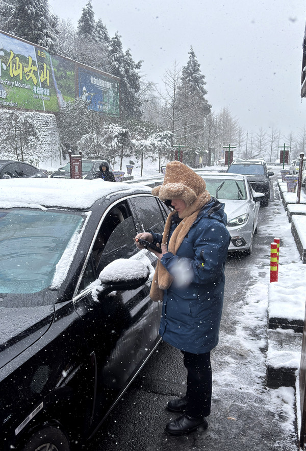 雪景中的仙女山宛如仙境,吸引了众多游客前来观赏游玩。游客们纷纷陶醉在这银装素裹的美景中,对景区良好的交通秩序和贴心的服务赞不绝口。一位来自四川的游客兴奋地说:“元旦假期选择来仙女山真是太明智了!这里的雪景太美了,而且景区的交通和服务都这么好,让人感觉特别舒心。这姜茶喝下去,浑身都暖和了,真的非常感谢工作人员!”