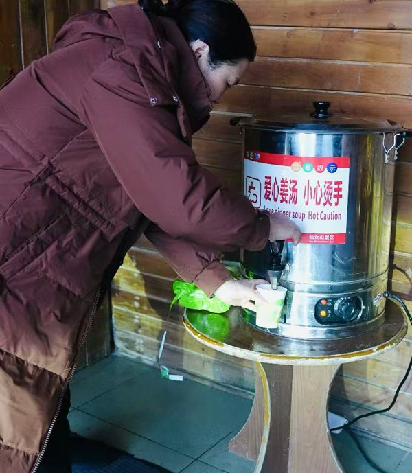 除了交通保障有力,景区的服务也十分贴心周到。工作人员们早早来到岗位,为游客们提供各种帮助。尤其是那暖心又暖胃的姜茶,成为了景区内一道温暖的风景线。在游客休息区和各个景点,都摆放着热气腾腾的姜茶。工作人员们热情地为游客递上姜茶,让游客在寒冷的冬日里感受到浓浓的暖意。许多游客接过姜茶后,脸上都露出了幸福的笑容,纷纷为景区的贴心服务点赞。