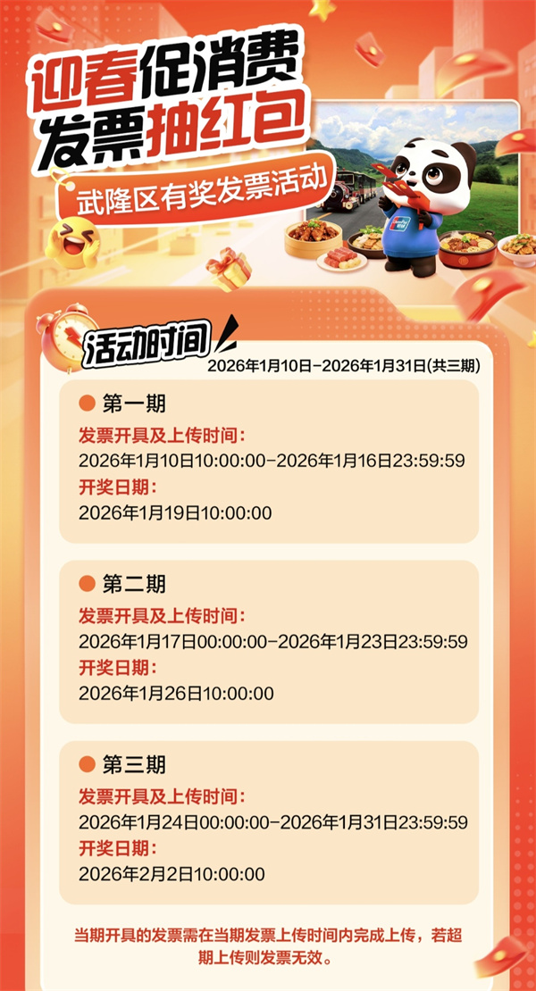 2026年,武隆率先送上诚意大礼!“迎春促销·有奖发票”活动已于1月10日上午10点正式拉开帷幕,将持续至1月31日。在武隆旅游、购物、享美食,您手中的发票很可能变成“开年红包”,让您的消费体验超值加倍!