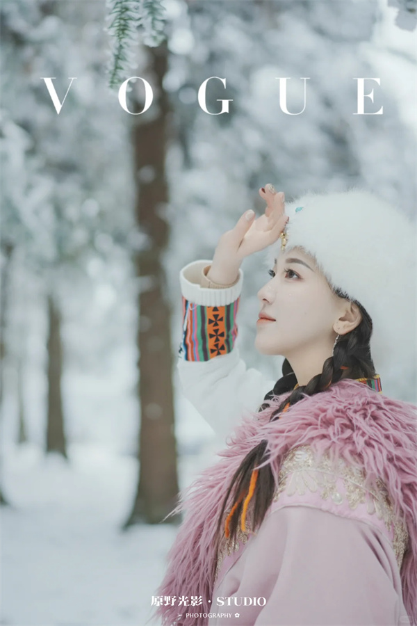 树顶漫步:站在观景台上,身着古装,背后是连绵的雪山和茫茫的林海雪原,震撼的场景非常适合拍照。