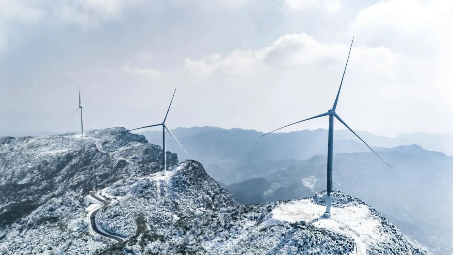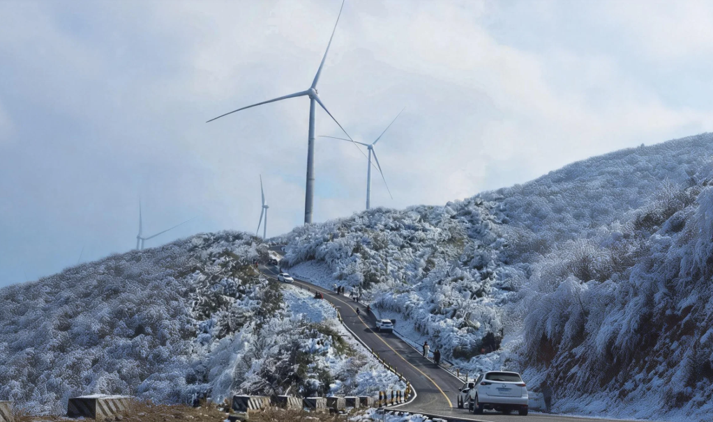 相比仙女山的名声在外,罩云山更像是一位深藏闺中的冰雪美人。这里海拔更高(1948米),雪期更长,雪质更纯净。最独特的是,数十座巨型白色风车沿山脊矗立,在雪原上构成了一幅极具视觉冲击力的现代画卷。