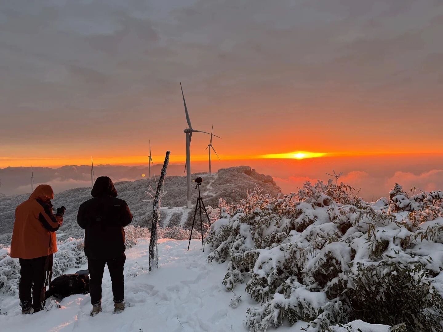 拍摄日出、云海与雪景风车共存的壮丽画面