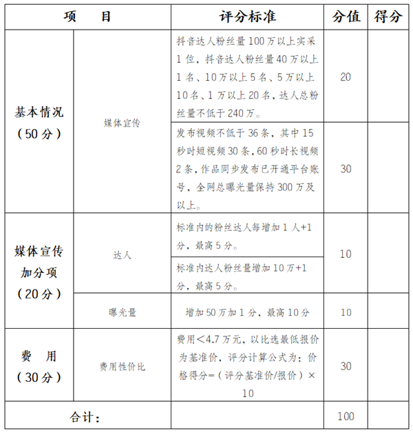 一是抖音达人粉丝量100万以上1名并实采发布两条视频(春节前后各发布一次,间隔时间不低于20天),抖音达人粉丝量40万以上1名、10万以上5名、5万以上10名1万以上20名,达人总粉丝量不低于240万;二是计划发布视频36条,15秒时短视频30条,60秒时长视频2条;三是所选达人需将作品皆同步发布全网已开通账号的平台;四是所发作品全网总曝光量不低于300万;五是单一达人单一平台只能发布一条视频,重复发布视频及流量不计算视频条数及总曝光量(实采除外)。五是总费用不高于4.7万元。