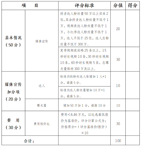 一是抖音达人粉丝量50万以上2名并实采,其余抖音达人粉丝量不低于1万,视频类达人粉丝量不低于1万,小红书达人粉丝量不低于1万,达人总粉丝量不低于300万;二是贵州达人不低于25名。三是计划发布视频或攻略25条以上,15秒时长视频10条,30秒时长视频10条,60秒时长视频5条,总曝光量保持300万及以上。四是单一达人只能发布一条视频,重复发布视频及流量不计算视频条数及总曝光量。五是总费用不高于4.46万元。
