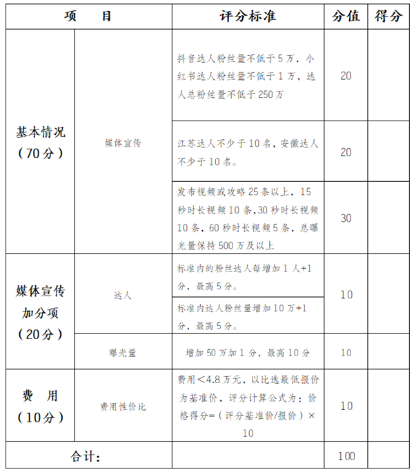 (四)达人要求:一是抖音达人粉丝量不低于5万,小红书达人粉丝量不低于1万,达人总粉丝量不低于250万;二是江苏达人不少于10名,安徽达人不少于10名。三是计划发布视频或攻略25条以上,15秒时长视频10条,30秒时长视频10条,60秒时长视频5条,总曝光量保持500万及以上。四是单一达人只能发布一条视频,重复发布视频及流量不计算视频条数及总曝光量。五是总费用不高于48000元。