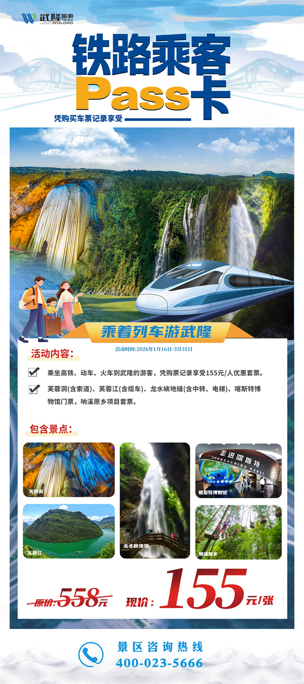 武隆景区为乘坐高铁、动车、火车前来的游客送上超值福利——铁路乘客Pass卡!1月16日至3月31日,仅需155元,五大王牌景区任你撒欢,让你的旅途从“赶路”变成“玩路”!