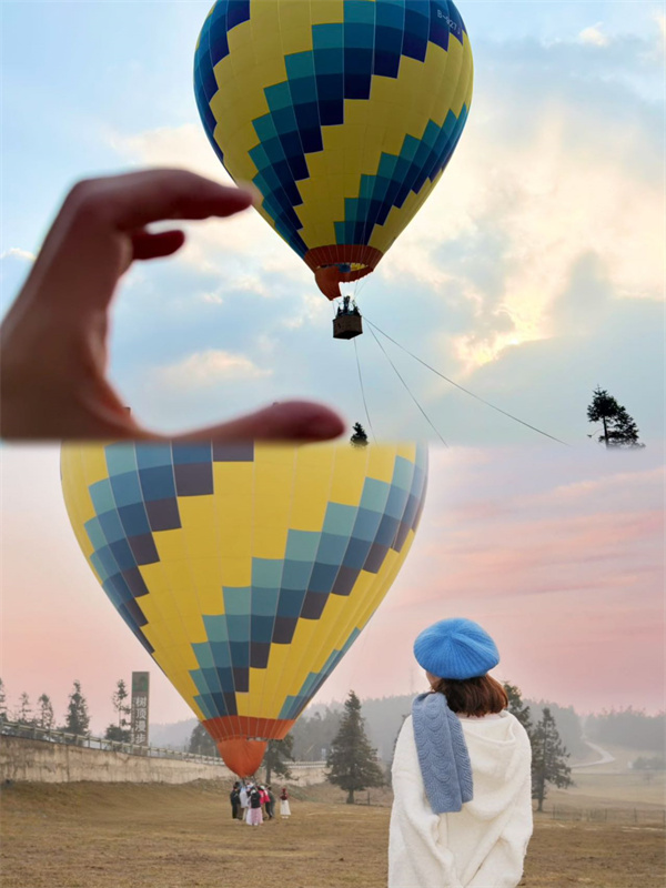 仙女山景区热闹非凡,其中,“热气球”项目更是为游客们提供了俯瞰仙女山全景的绝佳视角。随着热气球缓缓升空,游客们如同置身于空中楼阁,整个仙女山的壮丽景色尽收眼底,大家纷纷称赞这个体验既刺激又美妙。