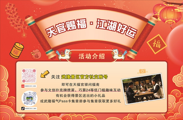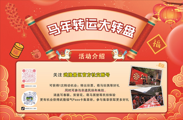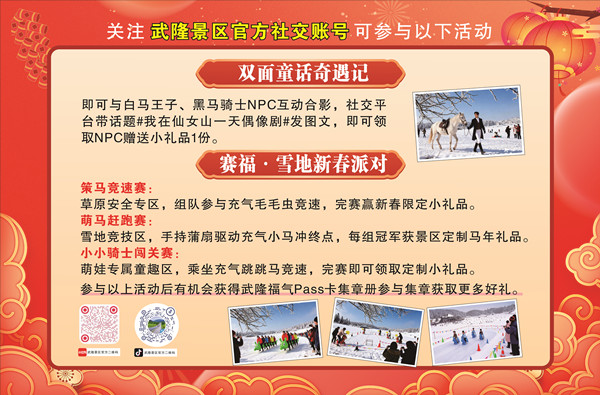 春节期间的武隆,还有积福.武隆福气PASS卡、遇福.遇见浪漫童话、赛福.雪地新春派对、见福.踏江湖见万福、送福.好运武隆五大主题活动轮番上演,精彩不断,欢乐不停!