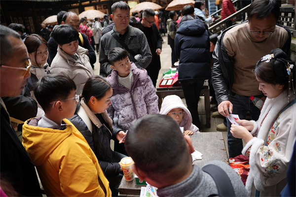 积福:游客手持福气PASS卡穿梭各景区集章打卡,兑换文创好礼的惊喜声不断。