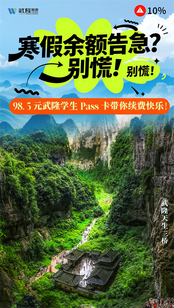 同学们,寒假余额告急,是不是一想到开学就脑袋嗡嗡?莫慌,98.5元武隆旅游学生Pass卡带你续费快乐!赶紧抓住寒假的小尾巴,到重庆武隆来一场收心之旅,让你元气满满迎接新学期!