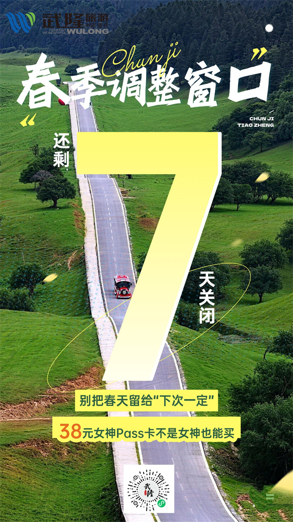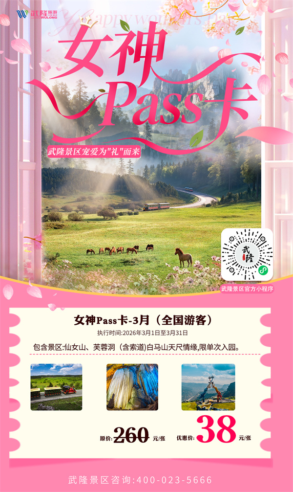三月的尾声敲响浪漫钟声,武隆已悄然换上春日盛装。百花开,暖阳复,空气中弥漫着春天的味道。而武隆景区「女神狂欢月」,也迎来了最后的7天狂欢——仅需38元,便可解锁这张春日限定福利,畅游仙女山、芙蓉洞(含索道)、白马山天尺情缘。