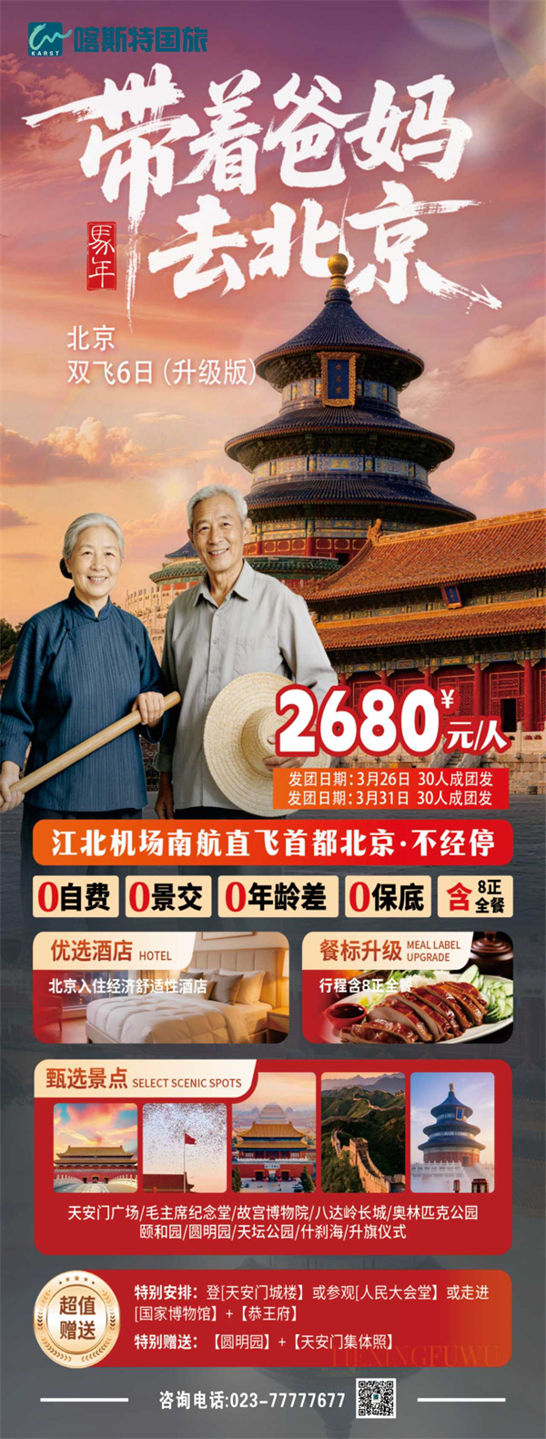 小时候总被爸妈捧在手心,长大后才发现:他们藏了一辈子的心愿,不过是去首都北京看一看。想带爸妈坐飞机、逛天安门、打卡故宫长城,可打工人忙工作、忙家庭,抽不开身全程陪同?别慌!孝心不用硬扛,专业团队来帮忙,这波“云尽孝”直接拉满幸福感。