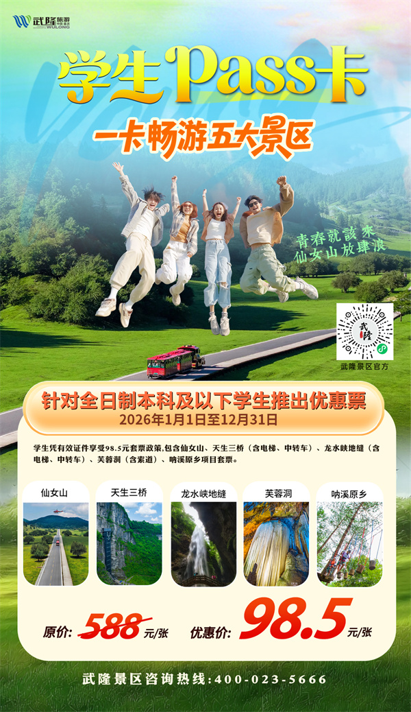 包含景区:仙女山、天生三桥、龙水峡地缝、芙蓉洞、白马山天尺情缘景区。