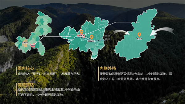 交通狂喜预警,重庆主城1小时直达白马山互通,再开40分钟就到基地,完美融入“1小时旅游圈”,不用长途奔波,周末说走就走,拒绝“在路上浪费时间”,主打一个便捷高效,打工人也能轻松解锁短途游!