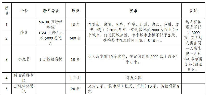为借助网络达人的影响力,对2026年五一节文旅活动进行全方位、多渠道的宣传引流,武隆景区拟采购新媒体及主流媒体宣传资源,提升景区的知名度和流量转化。请符合本次采购条件的供应商积极报名参与本次比选,现将有关事宜公告如下: