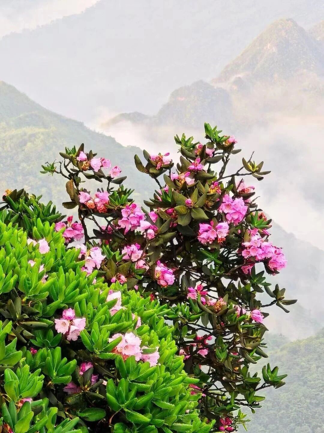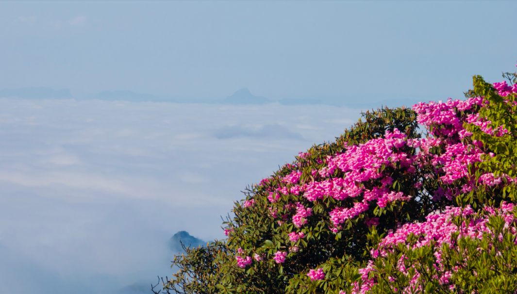 你站在观景台上,脚下是翻涌的白色云浪,眼前是燃烧般绚烂的高山杜鹃——花在云中开,云在花下流,分不清是花海浮在云上,还是云海沉在花下。