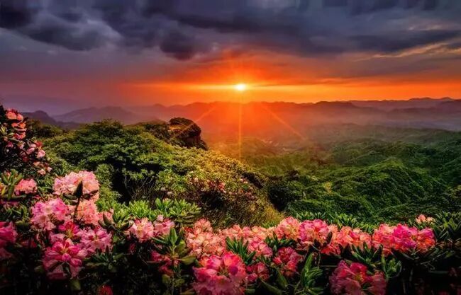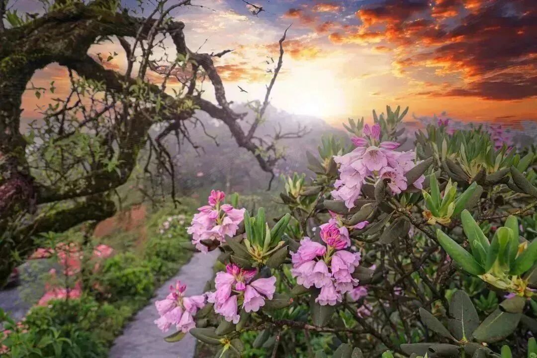 最奇妙的时刻在日出:第一缕阳光穿透云层,将云海染成金色,杜鹃花瓣上的露珠折射出彩虹般的光芒。随手一拍,就是不需要滤镜的壁纸级大片。