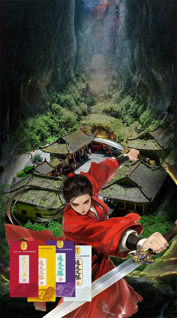 具体玩法:游客入园后可购买专属【通关文牒】,开启专属江湖闯关之旅。徒步穿行天生三桥峡谷秘境的途中,沉浸式打卡武侠实景,偶遇各式江湖异人,沉浸式感受刀光剑影、诗意洒脱的江湖氛围。完成全线闯关集章任务后,到清风阁核定段位,领取专属令牌。