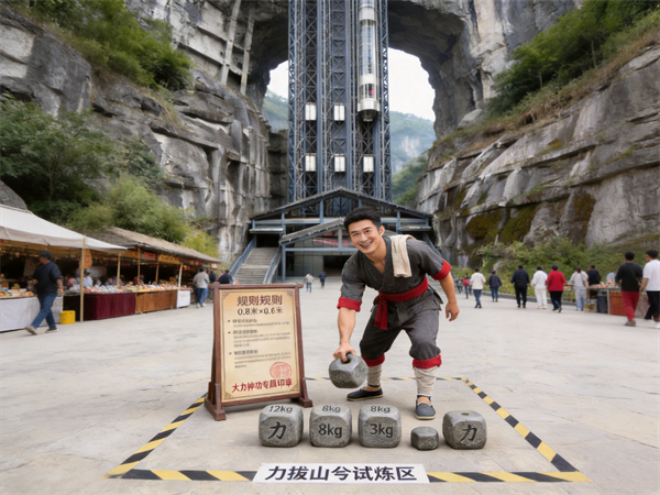 第一关:力拔山兮——滑竿广场,力量试炼。举石锁、展筋骨,练就“大力神功”。