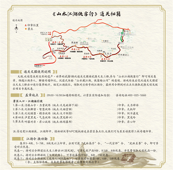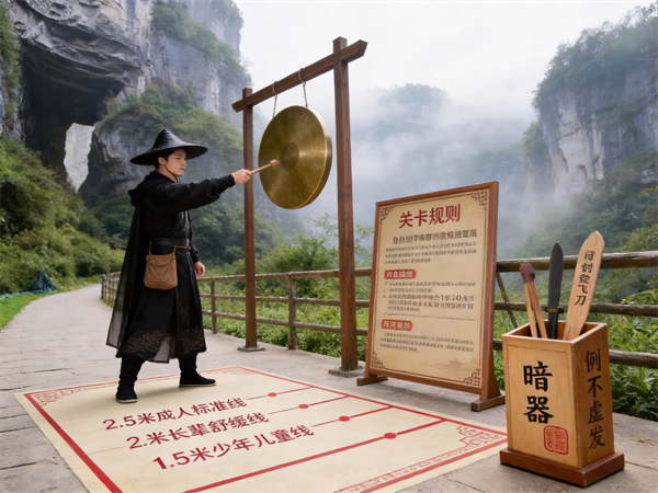 每一位游客,皆为大侠。在景区入口,你将领取一本江湖通关文牒,内藏五大秘境关卡、三位游走异人、八枚江湖印记。从此,你的每一步,都是一场修行;每一次闯关,都是一次成长。